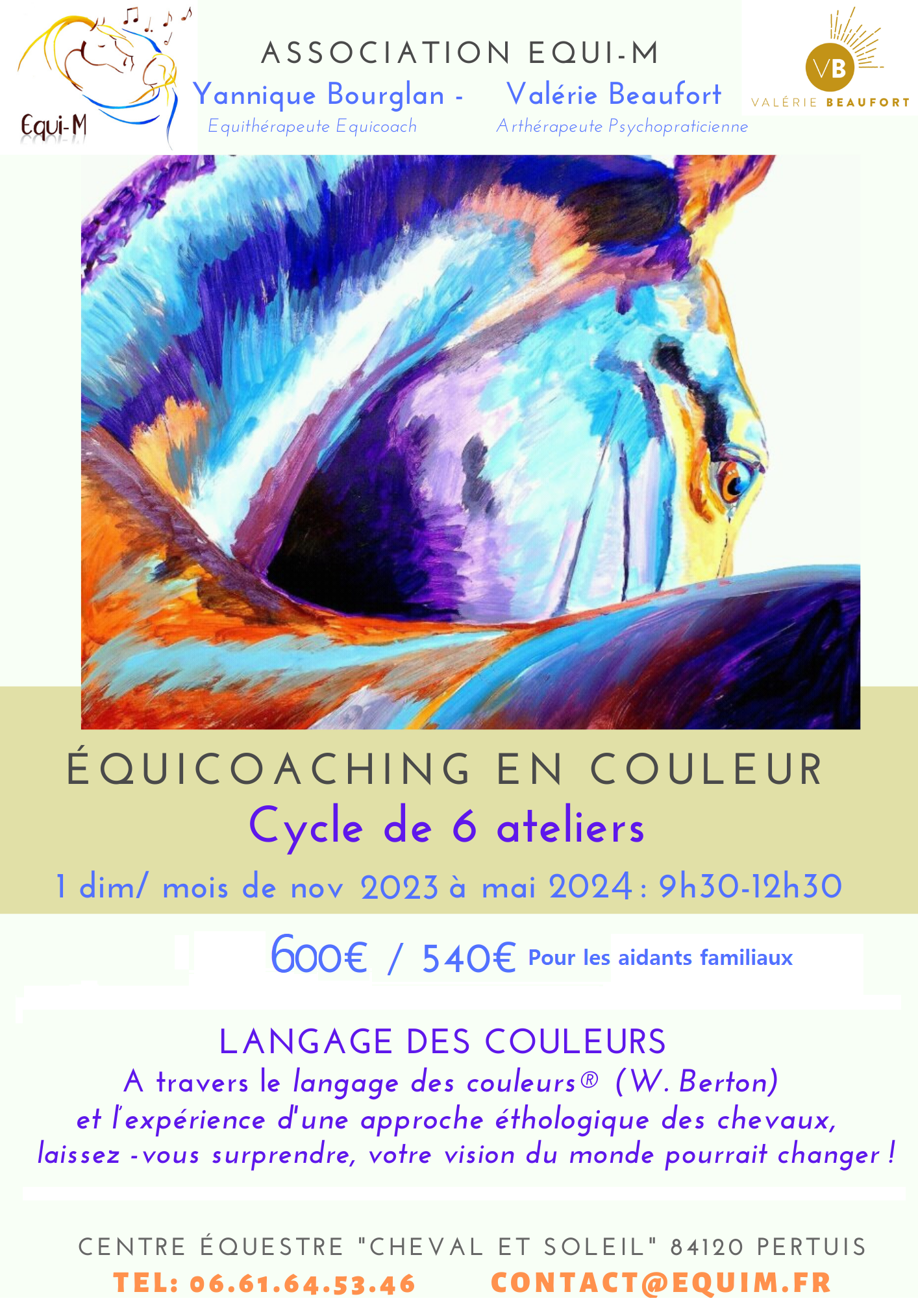 Concrètement, l’adhésion à l’association inclue une séance d’équicoaching de soutien aux aidants familiaux. Nous proposons également des séances de groupes ou individuelles et des ateliers joyeux et vivifiants mêlant les approches artistiques et équestres ( notamment autour du Langage des Couleurs®, rendus accessibles par des tarifs préférentiels.