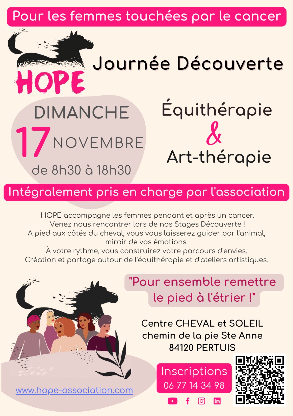 J'ai rencontré Yannique en 2024, en Haute Savoie au siège social de l'Association Hope qui nous propose des séjours pour les femmes traversant l'épreuve du cancer et j'ai rejoins l'équipe d'Equi-M dès la rentrée 2024 à Pertuis au centre équestre "Cheval et Soleil" pour proposer des actions d'équithérapie en séance individuelle ou de groupe.